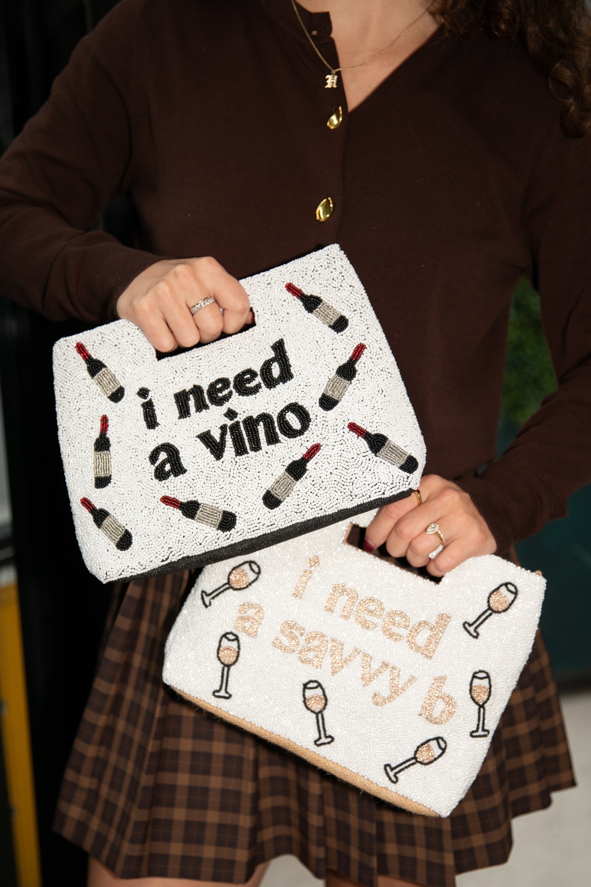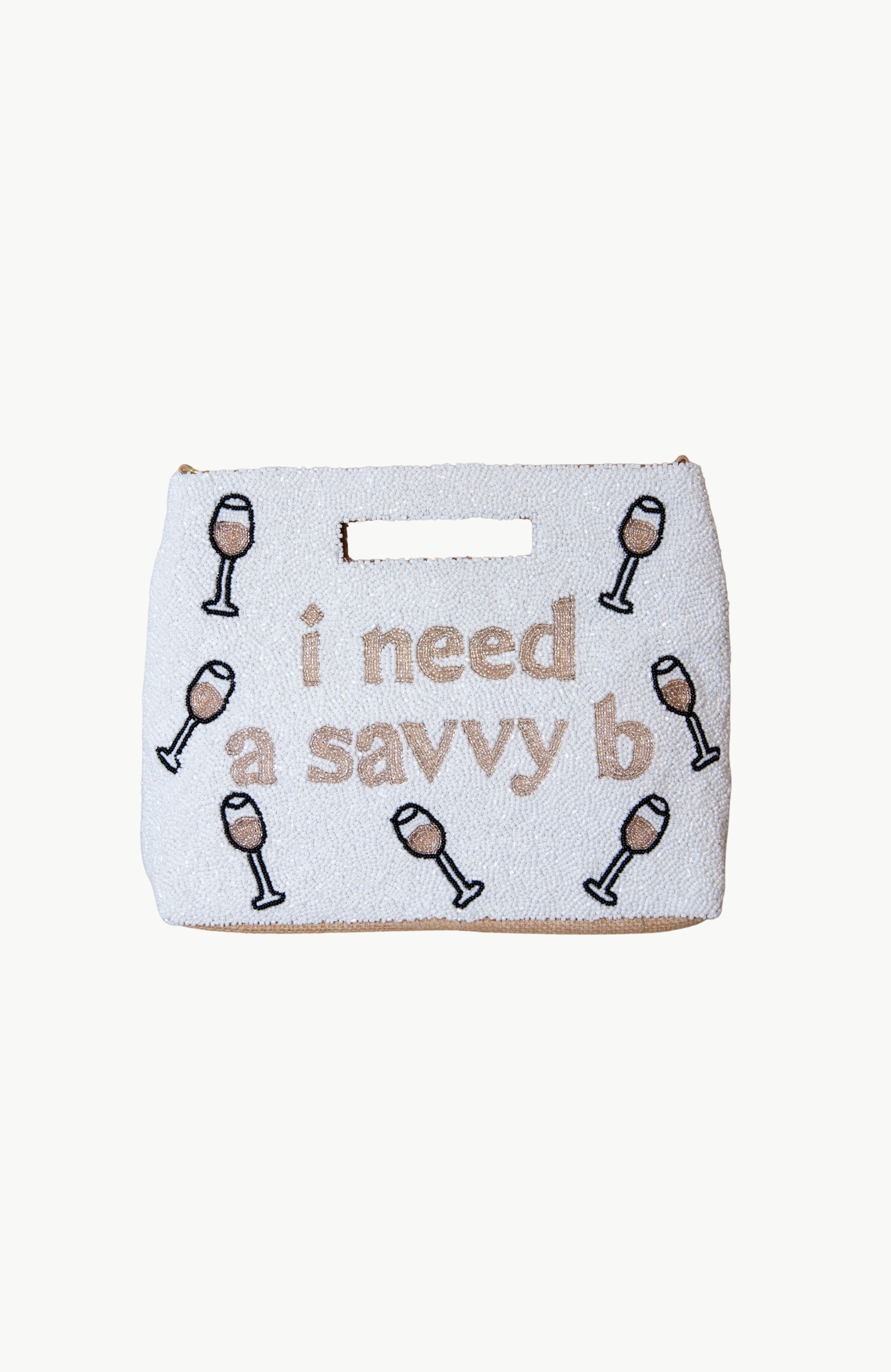 Part of our bestselling happy hour collection, the I Need a Saavy B Pouch celebrates a crisp glass of white wine with sparkling champagne colored beadwork and a bold message. Whether you’re headed to girls’ night, a destination dinner, or sipping on Sauvignon Blanc at golden hour, this pouch adds cheeky personality.
